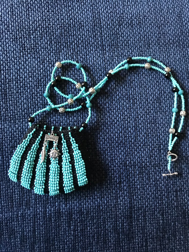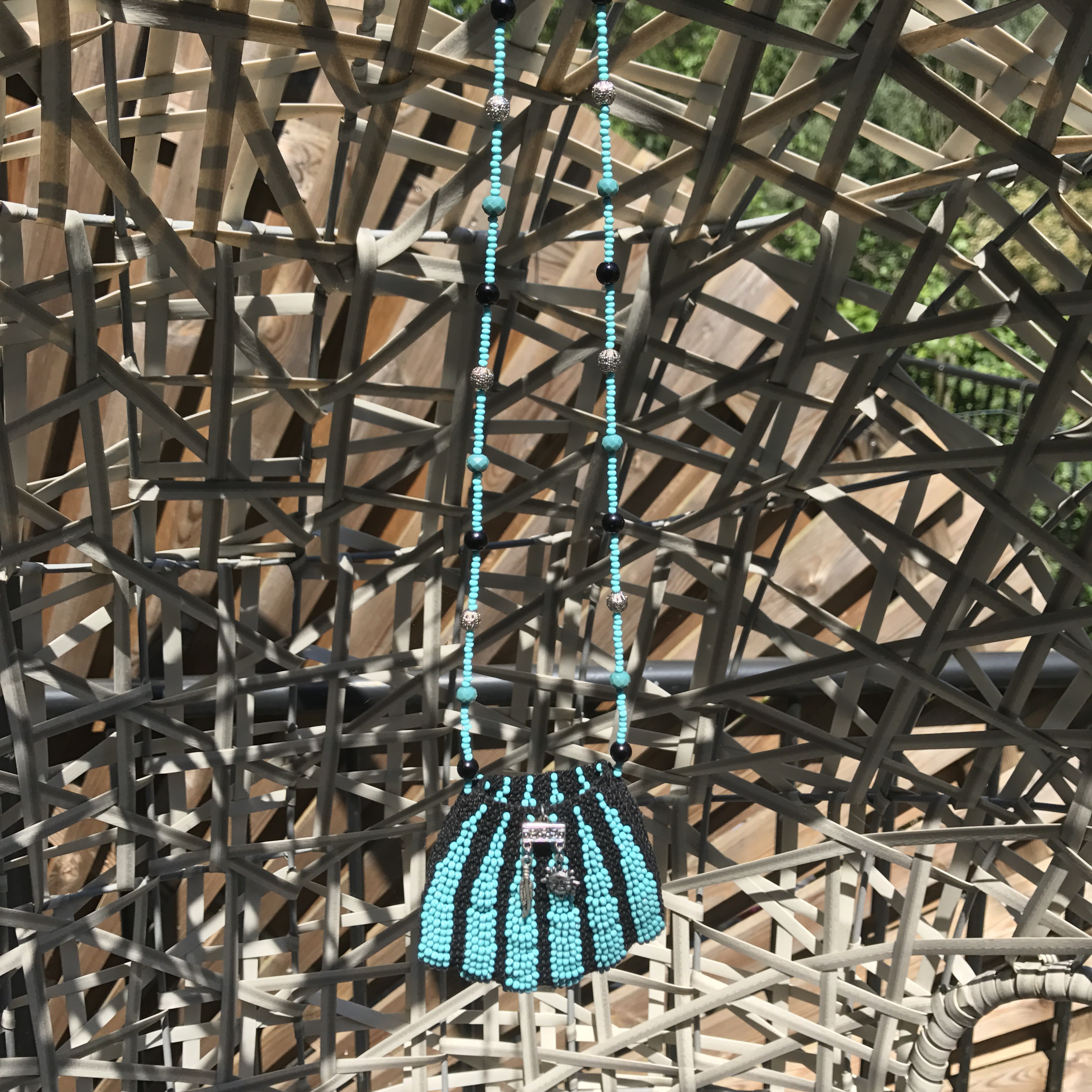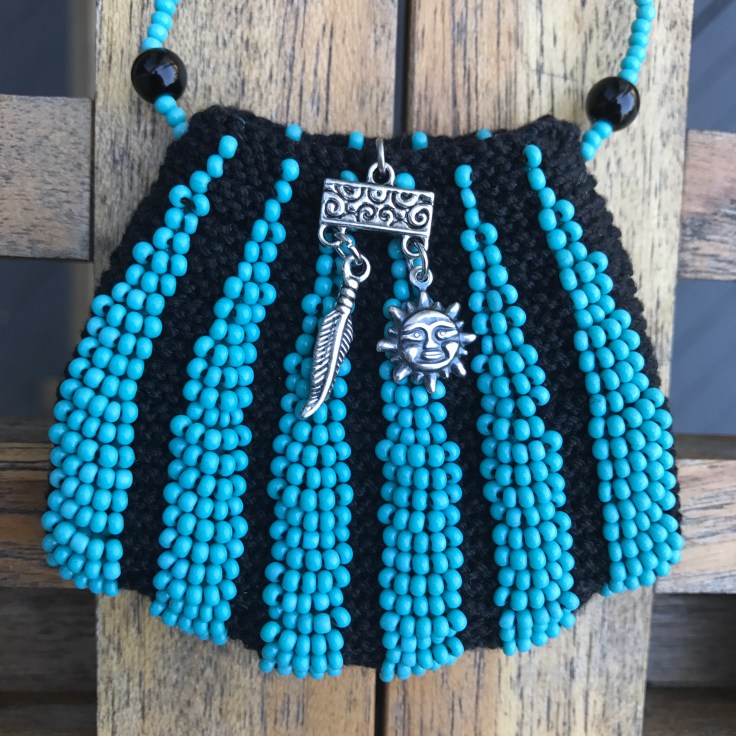 Here is my latest project complete. It was created using the book Beaded Knitted Pendant Bags written by Theresa Williams