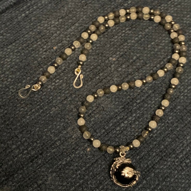 Completed project 25. The natural stone beads have a calming effect. Lava, snowflake quartz, malachite and smoky quartz beads.